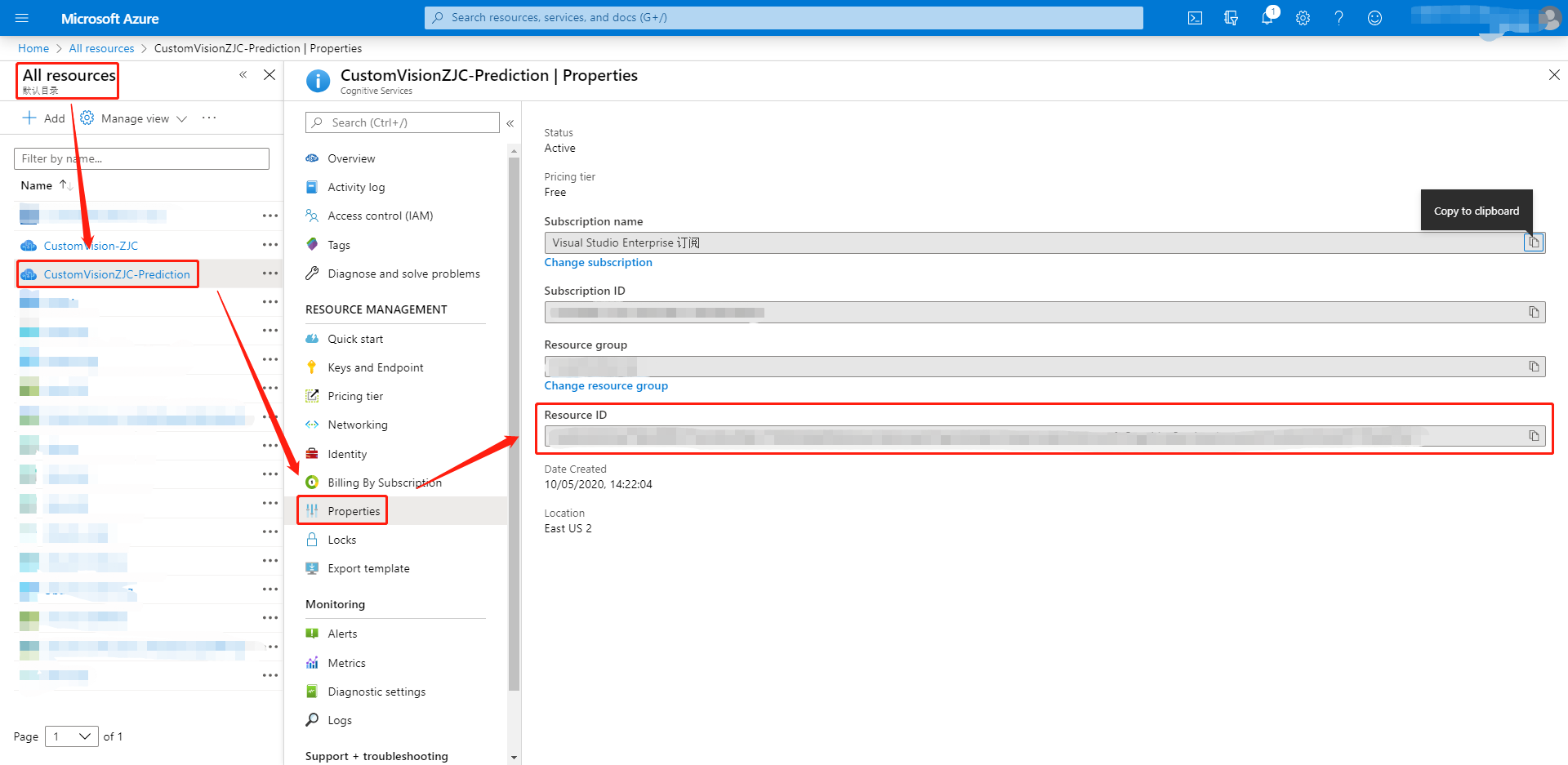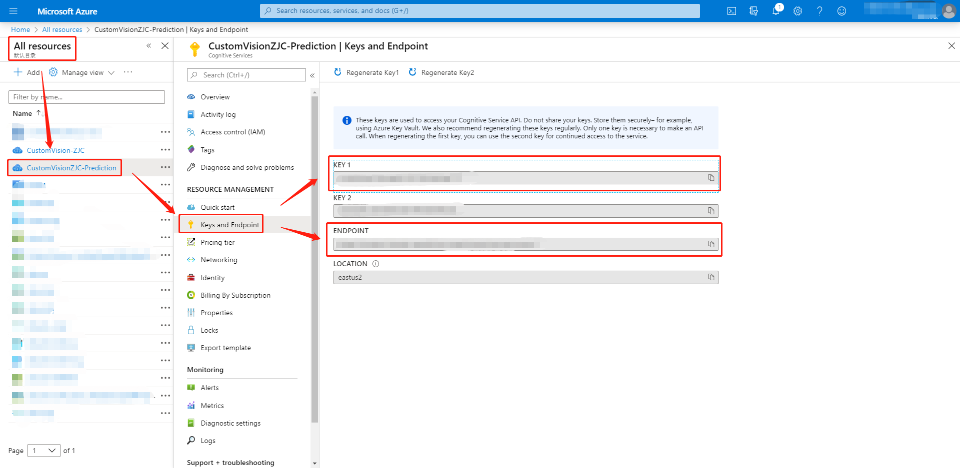 在Azure portal中找到之前创建的“Prediction resource”,进入“Keys and Endpoint”,里面可以找到