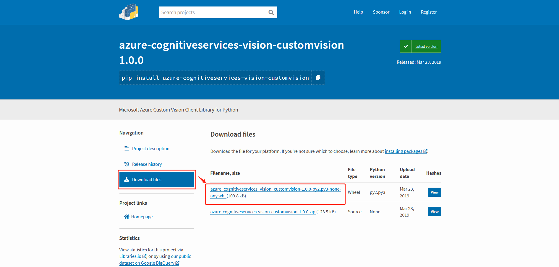 若下载超时或无法下载,可以去Pypi下载离线安装包:https://pypi.org/project/azure-cognitiveservices-vision-customvision/#files,如图: