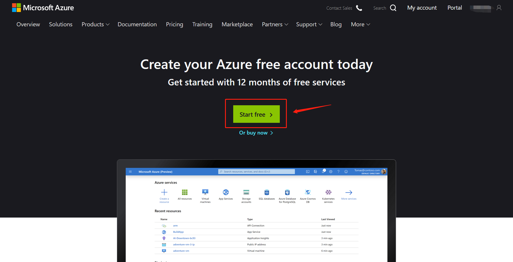 可以选择“Start free”试用12个月的免费账号,体验25个永久免费的服务,并在30天内拥有$200的Azure免费额度。