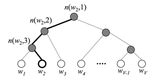 其中叶子结点 表示所有的词,我们要计算的是目标词 的概率,具体是指,从根节点开始随机走,一直走到 所经过的概率。因此我们还需要分别定义每个非叶子节点向左走和向右走的概率,其中 表示 Sigmoid 函数: