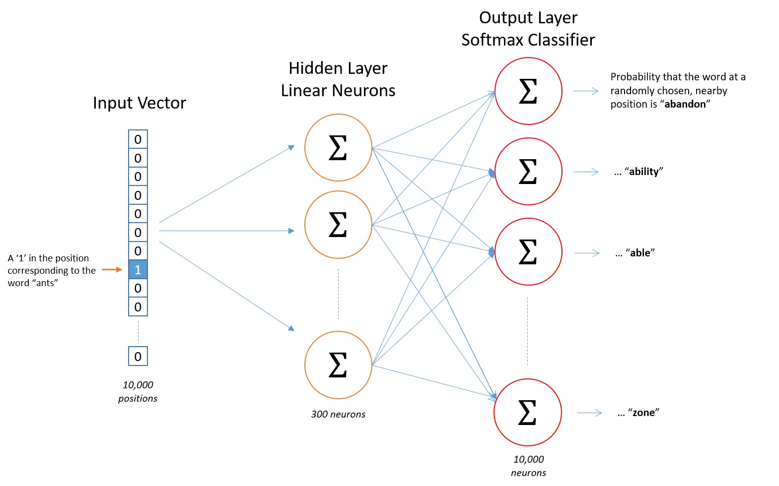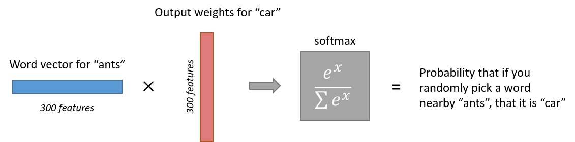 我们得到了1x10,000的 output 结果,假设词汇表中第123个词为“car”,第6666个词为“small”,那么根据常识,output 中第123个数值将会小于第6666个数值,因为相对于 “ants” 和 “car”,“ants” 和 “small” 具有更强的相关性,当出现 “ants” 时,上下文更有可能出现 “small” 而不是 “car”。