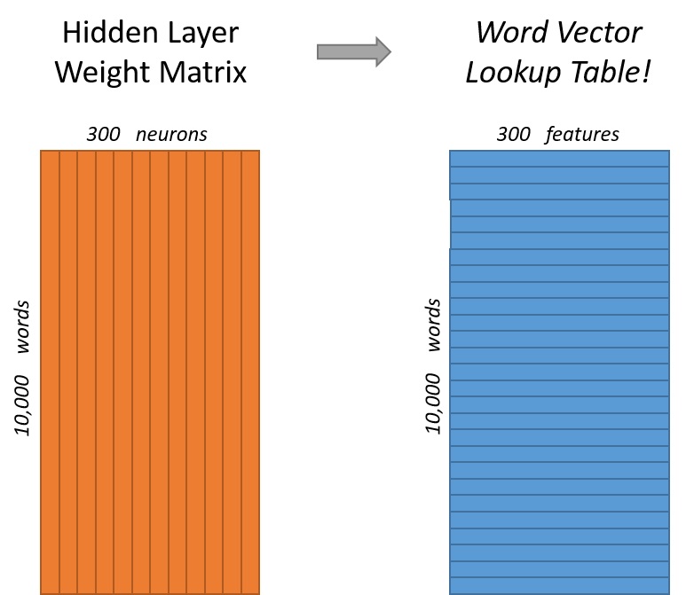 隐含层其实就是一个简单的全连接层(Fully Connected Layer),后面不接激活函数,本例中有300个神经元,表示每个 Word 将会提取出 300 个特征作为 Word vector,因此隐含层的参数就是一个 10,000 x 300 的矩阵,我们称之为 Weight Matrix,每一行表示一个 Word vector,如下图所示。
