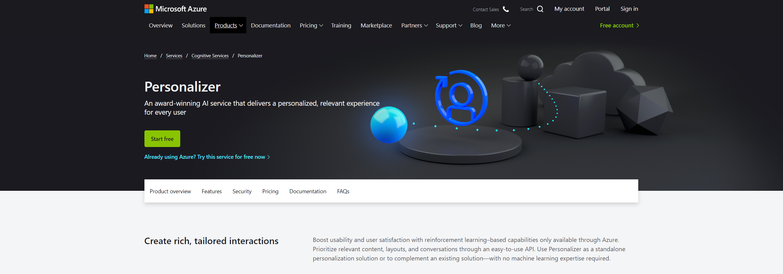 Azure Personalizer 官网 : https://azure.microsoft.com/en-us/services/cognitive-services/personalizer/