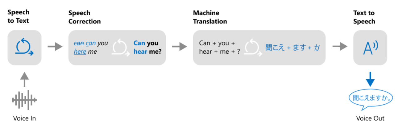 Azure Speech Translation 的工作流如下图所示,可以看到它主要由4个模块组成,包括前两篇文章提到过的 Speech to Text、Text to Speech 这两个模块用于输入和输出,Speech Correction 模块用于规范化文本(比如删除口头禅)并自动更正某些明显的语病,Machine Translation 模块进行文本翻译。